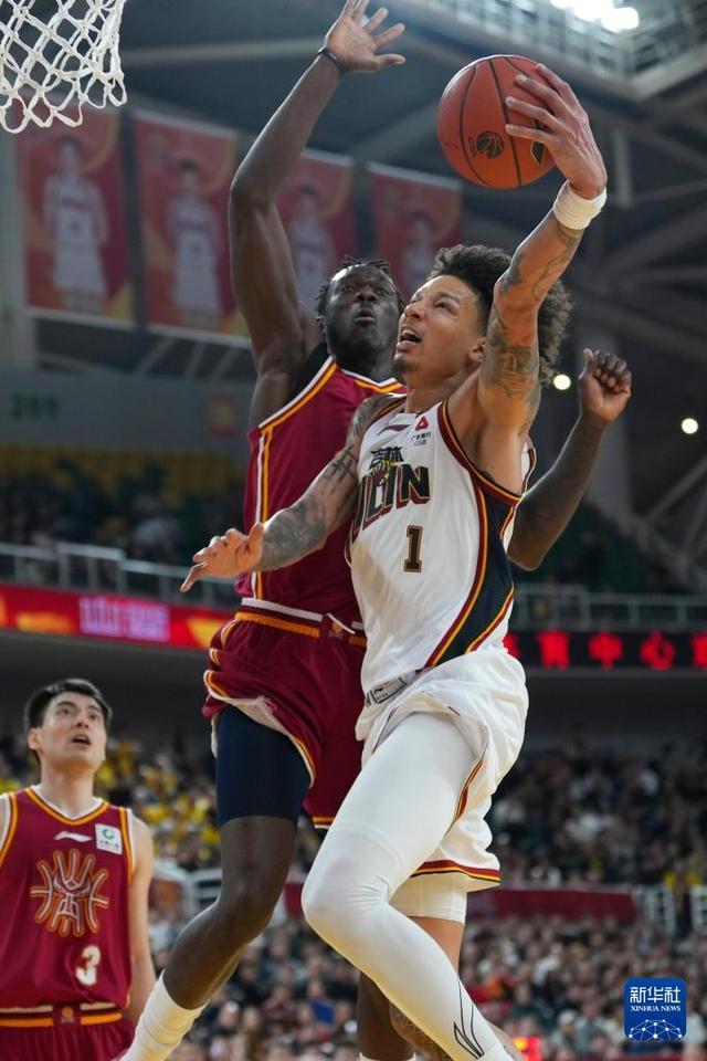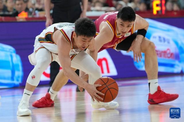 3月11日,吉林長白山恩都裏隊球員薑偉澤(左)和山西汾酒隊球員於米提在比賽中爭搶。新華社記者 楊晨光 攝