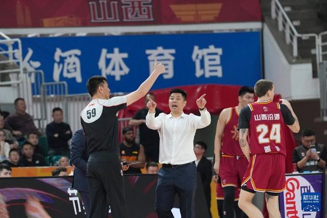 3月11日,山西汾酒隊主教練潘江(左二)在比賽中向裁判申請挑戰。新華社記者 楊晨光 攝