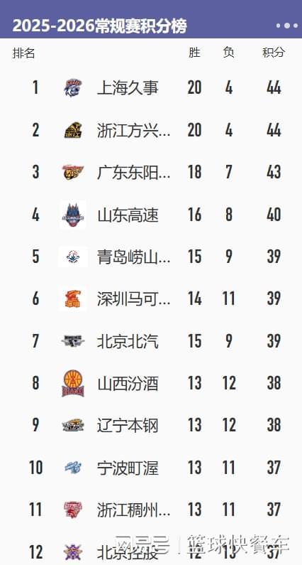 - CBA積分榜最新排名出爐!廣東終結連敗穩居第3:上海第1遼寧第9
