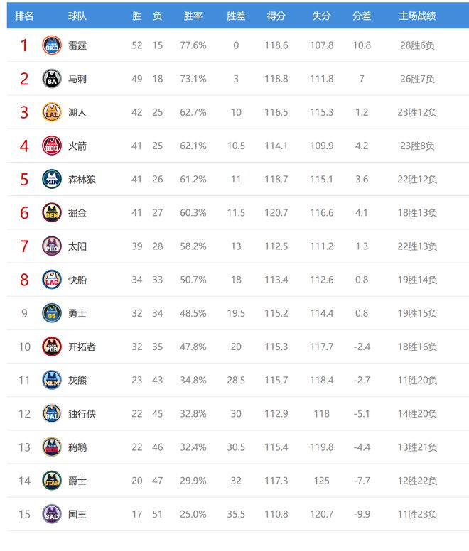 今日比賽後湖人、火箭排名互換,掘金、森林狼排名互換,其他西部球隊排名不變。