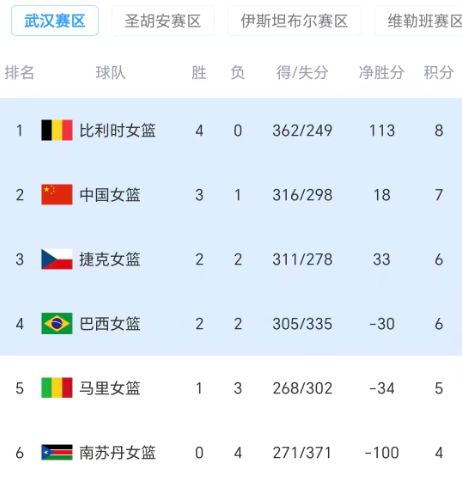 北京時間3月15日晚上,女籃世界杯預選賽小組賽武漢賽區第四輪全部結束,中國女籃84-74險勝捷克女籃、比利時女籃102-64大勝南蘇丹女籃、巴西女籃76-73擊敗馬裏女籃。至此,中國女籃提前一輪出線、南蘇丹女籃提前一輪出局。