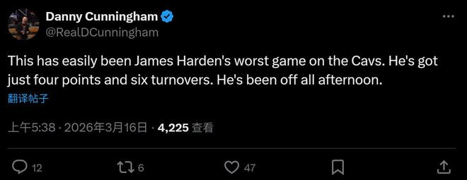 正如賽後騎士跟隊記者Danny Cunningham所說:“這無疑是哈登加盟騎士以來最差的一場比賽,整場比賽他的狀態都十分低迷。”