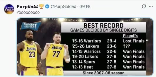 另一項數據更嚇人:分差個位數的比賽,湖人23勝6負,勝率79.3%。自2007-08賽季以來,這個勝率排在曆史第二,僅次於2015-16賽季的勇士。