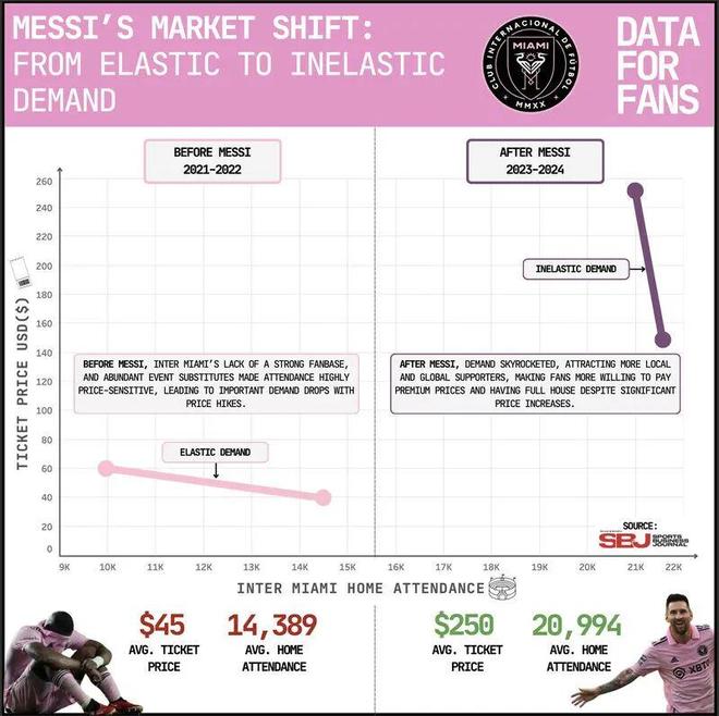 北美足球聯賽的動態定價,最經典的是2023年7月梅西加盟邁阿密國際的首秀。這場對陣墨西哥藍十字的中北美聯賽杯比賽,因為梅西的出現,賽前最低票價從29美元(約合210元人民幣)飆升到325美元(2340元),激增11.2倍!之後為平息球迷對票價火箭式上升的不滿,邁阿密國際主場對奧蘭多城的最低票價回落到105美元(710元),但比賽開始前又漲到160美元(1150元),不過,比賽因雷暴天氣被推遲1.5小時,最低票價又降到73美元(520元)。