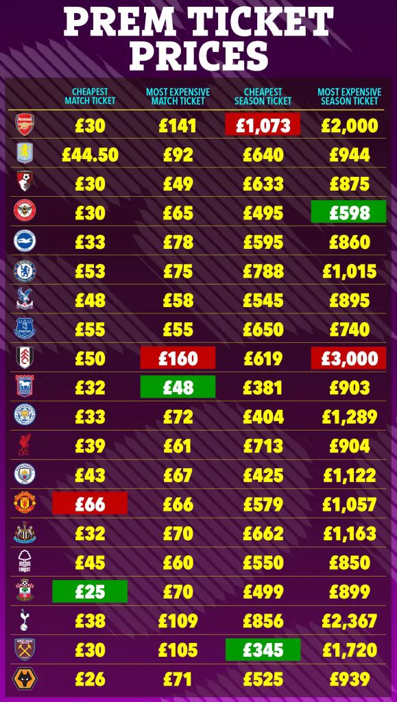 英超10家俱樂部成人最低季票價格少於700歐元(5800元),最低的西漢姆聯僅399歐元(3350元),但西漢姆聯最高檔季票價格1991歐元(16700元)。富勒姆最低季票價格563歐元(4700元),最高3570歐元(29900元),差距6.3倍。切爾西季票價格差最小——最低的1019歐元(8500元),最高1268歐元(10600元)。