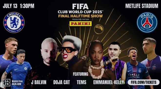 去年7月13日的世俱杯決賽,國際足聯臨時決定舉行史無前例的中場秀表演。格萊美獎得主說唱歌手Doja Cat、尼日利亞歌手Tems、雷鬼天王J Balvin聯袂表演,但最低票價並未因新增的中場娛樂秀上漲。國際足聯發布的決賽海報,表演嘉賓也占據了C位,將兩支參賽隊的球星擺在兩邊。