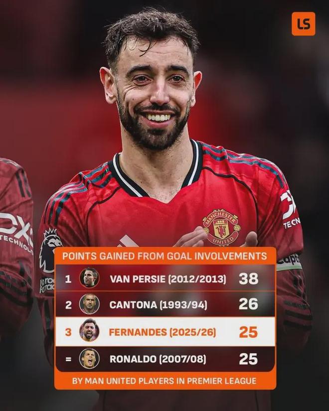 16次助攻。 B費正式加冕曼聯隊史英超單賽季助攻王 。